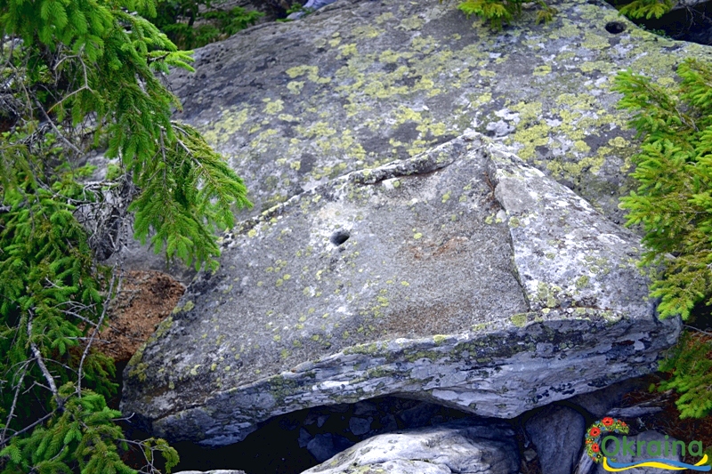На верхній плиті у центрі святилища, праворуч тунелю, є рукотворна виїмка, зорієнтована на схід, а в ній шість висічених поперечок. Це уявна лінія календарного екватора. Вона ділить сферу неба навпіл між зимовим і літнім сонцеворотами. Шість поперечок означають шість календарних місяців, коли день перевищує ніч, а сонце сходить у північному від екватора секторі. Решта шість місяців день завжди коротший від ночі, а сонце починає сходити південніше екватора. Рівнодення – єдина календарна стала дата, що є базотворчею точкою у побудові прадавніх календарів. На сході по екватору розташовані Камінь Довбуша у Завоєлах